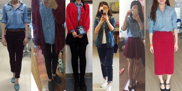 牛仔衬衫也是大家的心头好,基本人手一件的节奏,而且大家都很聪明的用红色来搭牛仔衬衫哦,真的很配,当然也有哒友用牛仔衬衫配浅灰色裙子,整个灰蒙蒙一片的赶脚啊。牛仔衬衫还确实属于好色型单品嘞!哒小鸣 - 拥有单一功能审美原则的搭配机器人