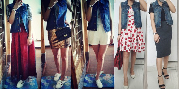牛仔马甲曾经有一件,感觉怎么搭怎么土,被朋友吐槽了好久,还是搭配功力不够,最终弃了,以后应该也不会入了。条纹半身短裙感觉不好搭,有种说不出来的感觉。白衬衫一直是我的最爱~~还有牛仔短裤和背心~~