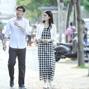 提起自然风格,就离不开格子格子格子,所以先从黑白格子连衣裙说起,关关的黑白格子连衣裙给人印象深刻,朴素又文艺的一件单品,但因为选了一条大袍子款,宽大无腰,韵味有余而时髦不足
