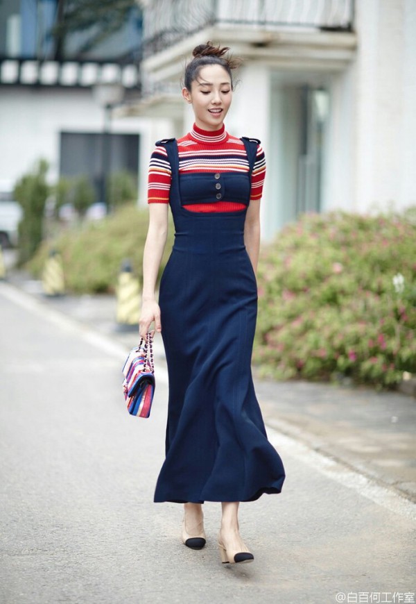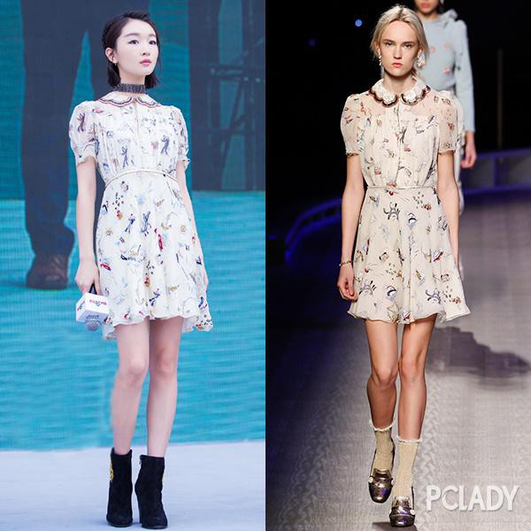 既然两人如此之像,著名博主艾里珊钟必须也不能错过黑白格子连衣裙啊。也是背心伞裙的款式,搭了黑色小西装。