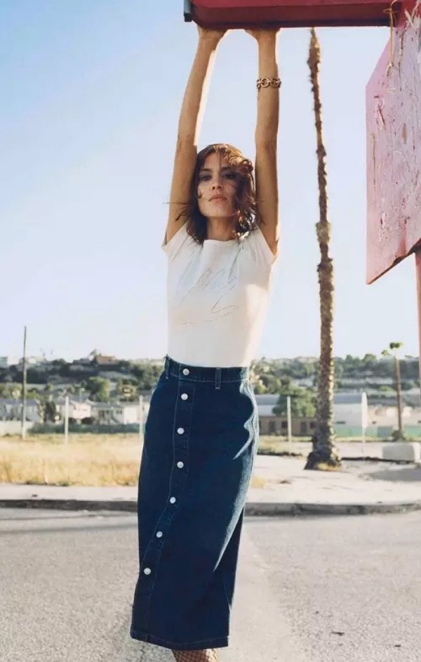 即使搭配白衬衫,把扣子解开两个,牛仔裙选撕扯的效果,是不是就一点不严肃啦