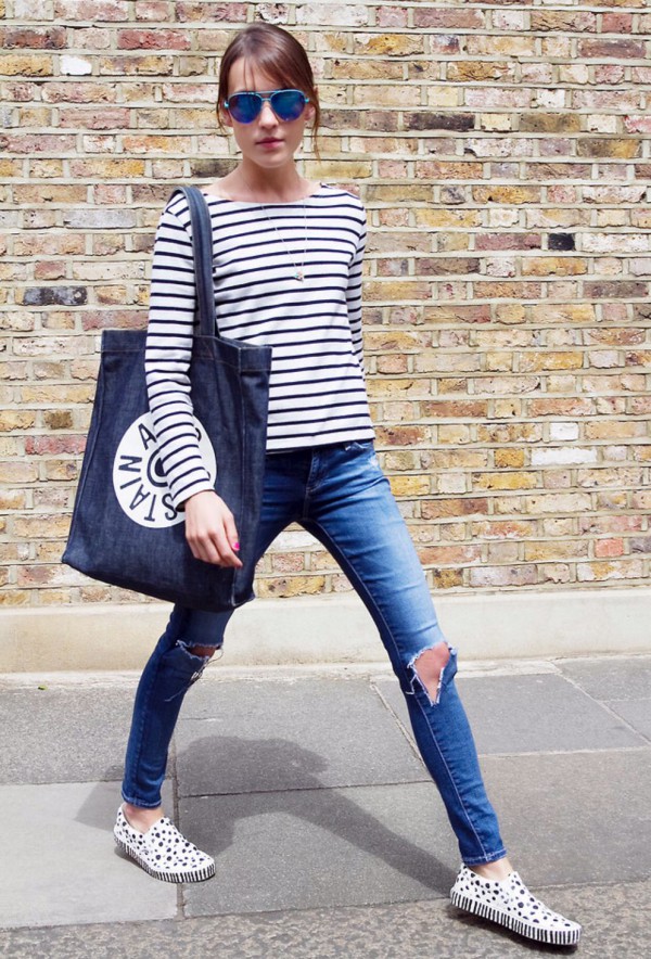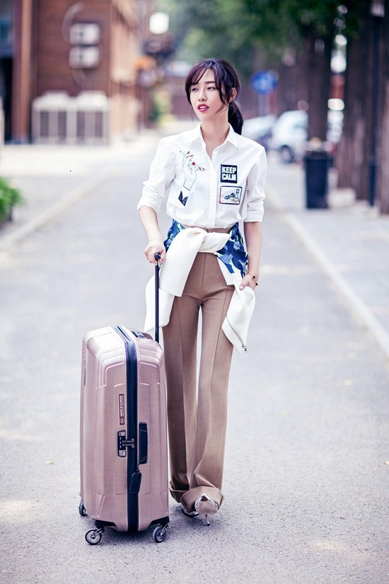 跟钟姐风格类似的Ella,选择用蓝白印花衬衫搭配,自然的更小清新一些