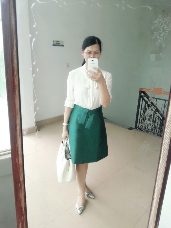 端庄大方,好看!我倒觉得四张衬衫是飘带款,裙子是光板的更好。或者换个简洁的衬衫。再多用点配饰。搭配点配饰耳钉啥的更完美了。其实有时配饰一上马上就时尚起来了。我们得像文文学习