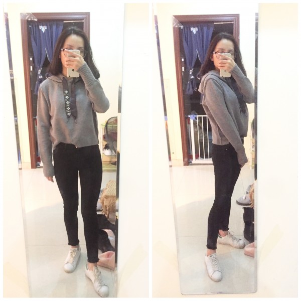 我觉得这件连帽针织衫要是前面的绳子是同样颜色的细绳会更好看更百搭更没有限制,穿多少年都可以