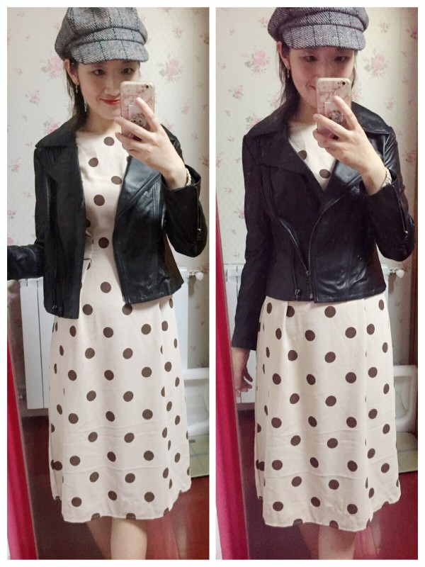 你配皮衣的波点裙,多长,有链接吗?团款里的V领衫是宽松款吧?