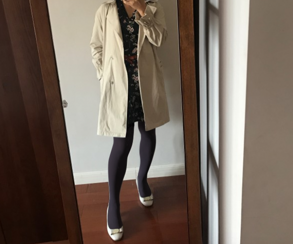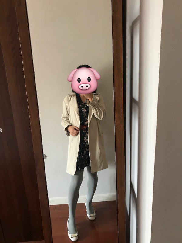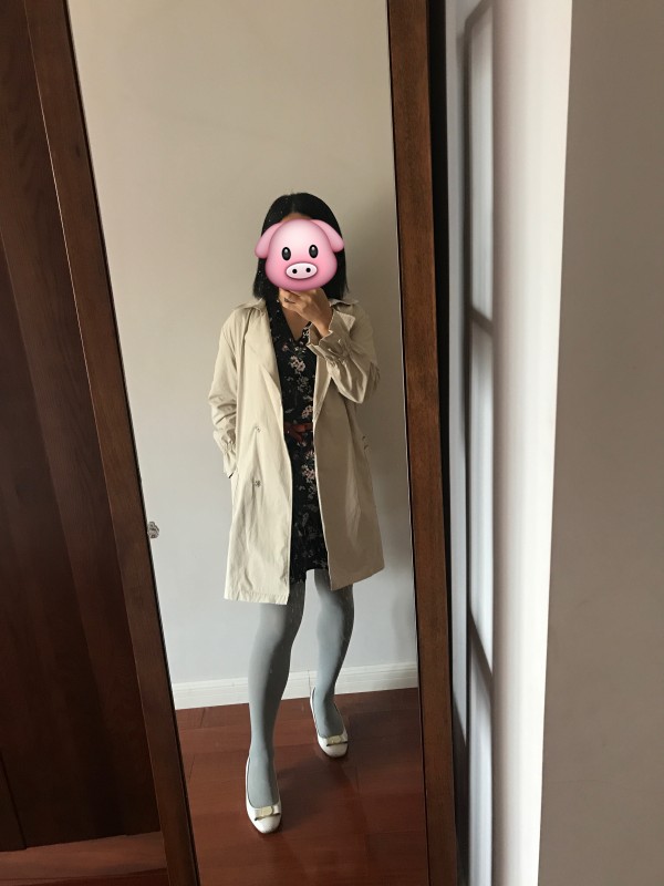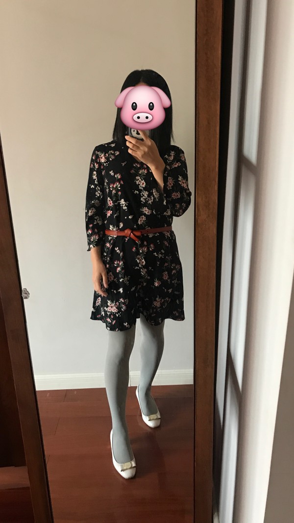 今天的搭配感觉怪怪的,上面深色印花裙,下面浅灰色慕斯丝袜,米色浅口鞋,有点头重脚轻了,看着不是很协调。