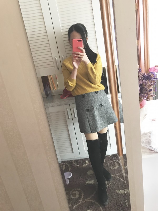 喜欢你第一身的黄毛衣+灰裙子!