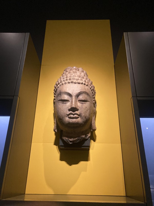 旁边还有一尊很大的龙门石窟唐代佛头,出自奉先寺。到了唐代,佛像已经非常中原了,神情威严。龙门石窟奉先寺大佛是龙门的宣传照,主佛卢舍那大佛高足足17米。根据这尊佛头估量,它虽不是主佛,但应该也有十几米高了,不知道我下次去龙门石窟能不能找到它的身体
