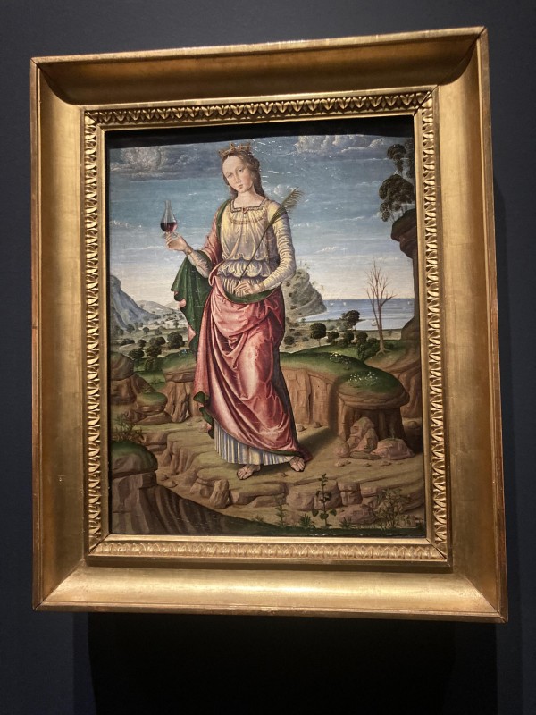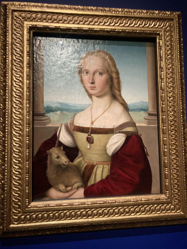 一幅是博尔盖塞的藏品——抱独角兽的年轻女子。独角兽象征着爱与贞洁,加之其华贵的服饰与珠宝,皆表明这是一幅订婚或婚礼肖像画。而画中这位美丽的女孩极有可能是劳拉·奥尔西尼·德拉·罗韦雷(1492–1530/31);独角兽正是其家族的纹章,而她的母亲则是以美貌著称的教皇亚历山大六世的情妇——朱莉娅·法尔内塞。
