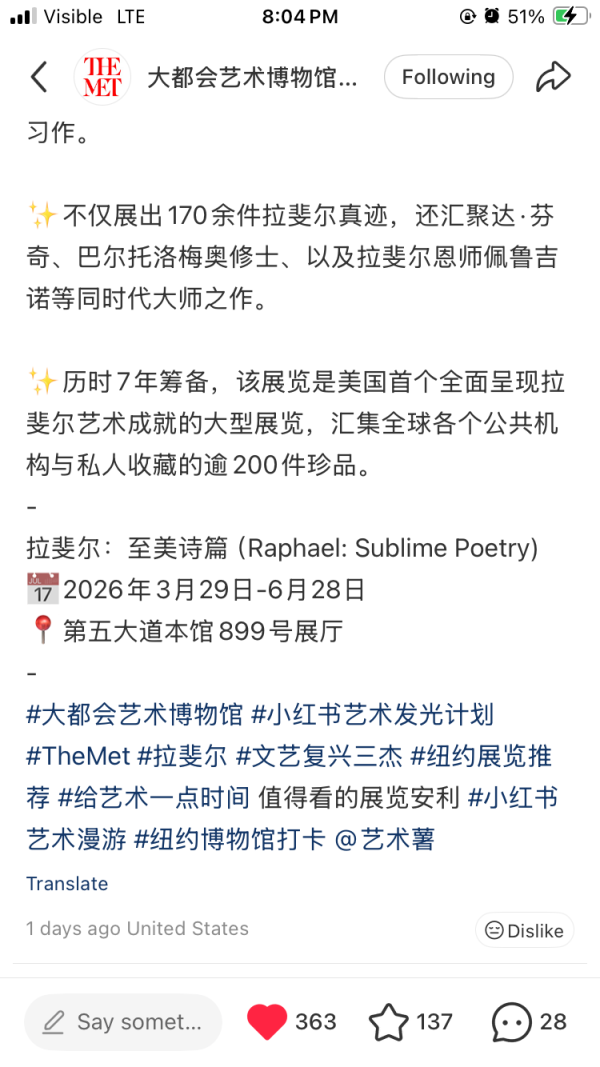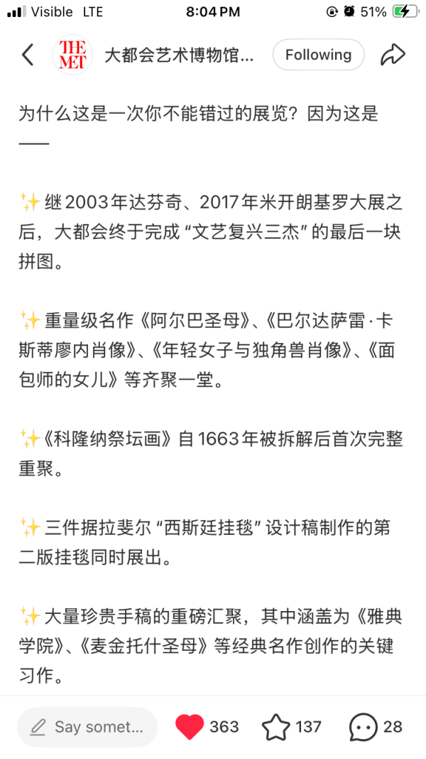 但第一天的体验并不是特别好。一是人太多,很难静心驻足一会儿。二是我预期过高,我以为能看到的草地圣母和金翅雀圣母都没有来,有几幅当打之作还是之前在国家美术馆看到的,而且很多草稿,有点失望。最后加之展厅昏暗憋闷——为了保护极脆弱的手稿,所以两个小时后就出来了。但经过一天的休整,以及我翻了翻自己拍的图片,第二天再去的时候(神奇的是第二天人很少)发现大都会确实已经很有诚意了。据说为了这次展览的成型,大都会协调了七年。虽然并没有我期待的那几幅,但从整个规模、藏品等级和数量,到布展,不得不说近些年绝对看不到更好的拉斐尔展了。尤其是对比于中国美术馆4月即将开始的文艺复兴展览的规模,此次拉斐尔回顾展正如大都会自己的宣传——once time in life。此生必去。