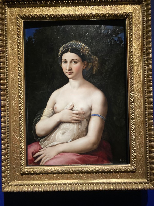 在女子的左臂上端,系着一条饰有精致金边纹样的蓝色缎带,并刻有铭文“RAPHAEL VRBINAS”(拉斐尔·乌尔比诺);这既是画家本人的署名,也是对那种充满诗意的“爱之羁绊”的视觉化呈现。这幅肖像画之所以被称为《福纳里纳》(意为“面包师之女”),是因为画中人物据信即是玛格丽塔·卢蒂(Margherita Luti)——拉斐尔的情人,同时也是一位面包师的女儿。