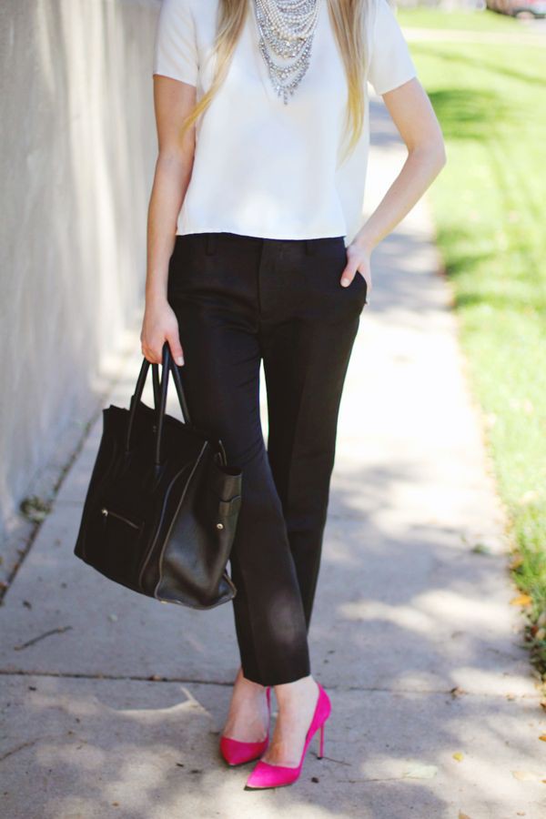 任何黑白配都适用于这身装扮,不管是休闲的白T还是精致的商务范儿,搭配一双玫红色尖头浅口高跟鞋立马就能让造型升级!像下图那样戴上statement necklace也是超级赞哦。