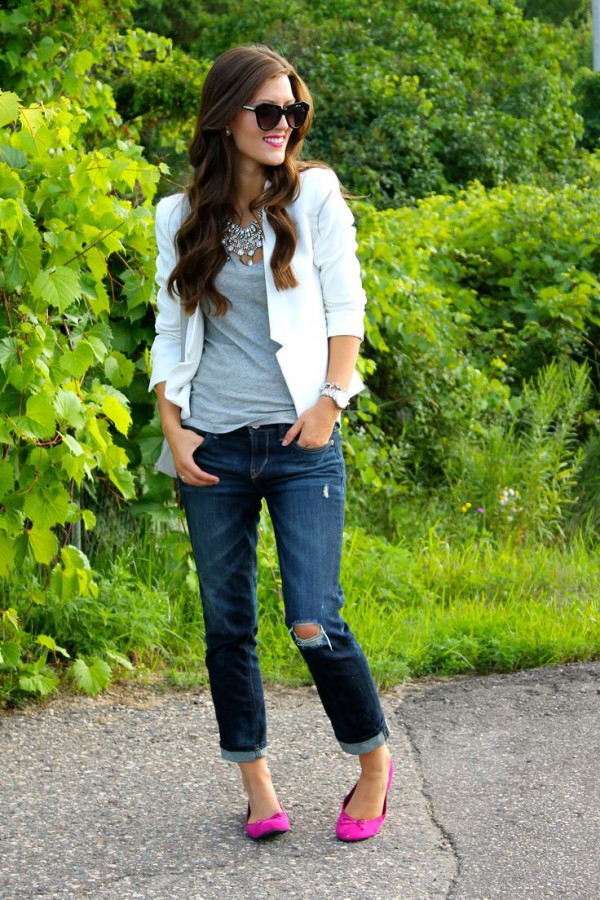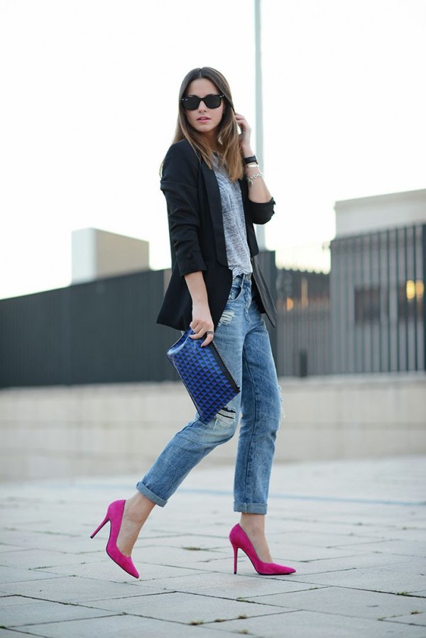 9.黑/白西服+灰色内搭+牛仔裤+玫红色浅口鞋