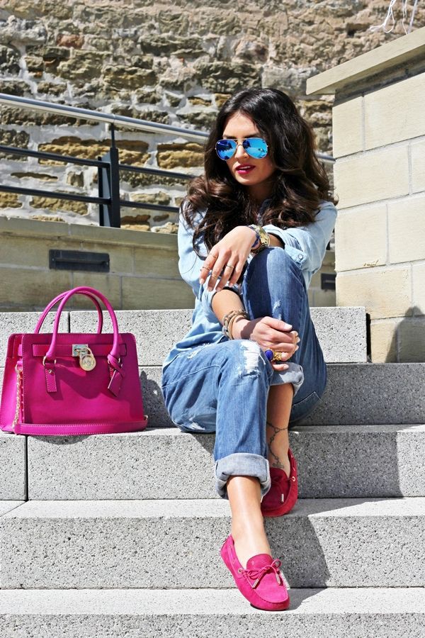 这点要记住喽,牛仔蓝和玫红色是超级配的,看看这一身效果就很棒吧,既休闲率性也不失时髦感,大家可以试试哈。