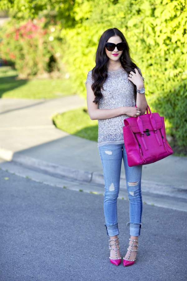 5.金属风亮片上衣+牛仔裤+玫红色浅口鞋
