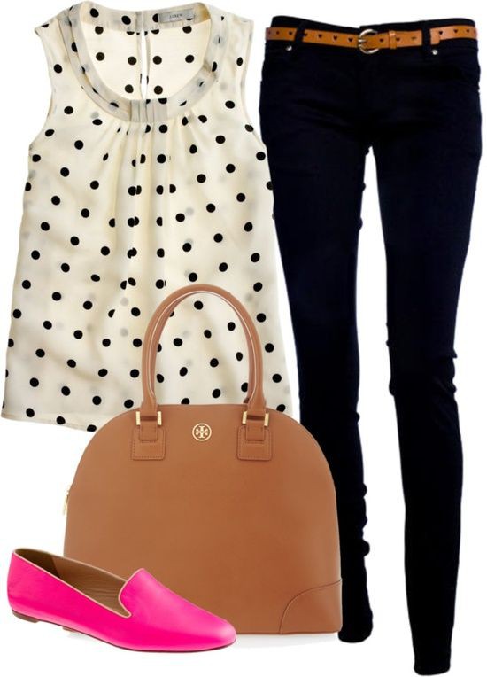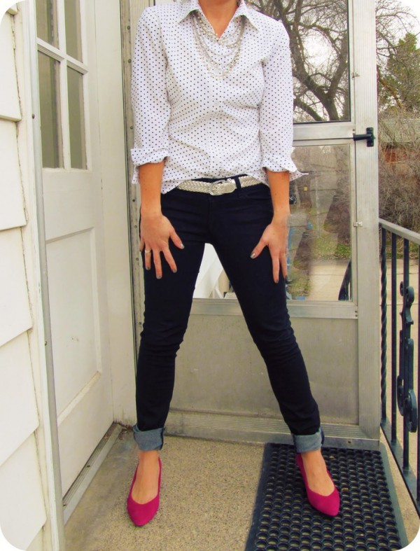 7.波点衬衫+小脚裤+玫红色浅口鞋