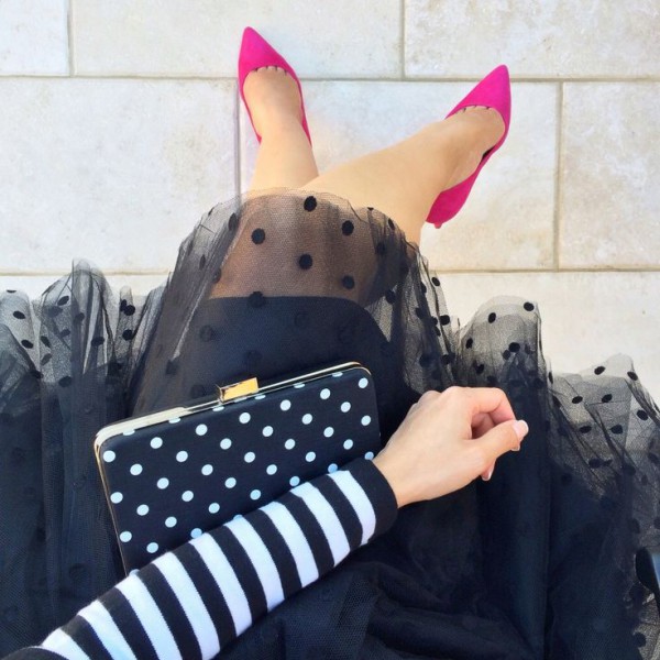 这张图需要大家发挥想象力喽,之前我们做过关于灰色蓬蓬裙的专题,这个是用黑白条纹衫搭配黑色蓬蓬裙,看似颜色比较深沉,但是只需一双玫红色浅口高跟鞋立马就让你变得鲜活起来哦。