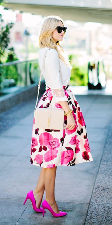 也是很简单的搭配,一款简单的白色上衣下配白底印花伞裙,印花的颜色最好是玫红色系的,刚好可以和鞋子的颜色相匹配,包包的颜色选择一款淡雅的白色或米色就好。