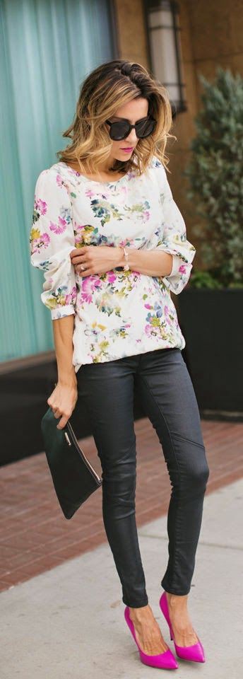 混搭风的组合也很巧妙,白底印花上衣清新淡雅,黑色皮裤帅气硬朗,再加上玫红色浅口鞋的优雅性感,整体下来让你十分与众不同哦。