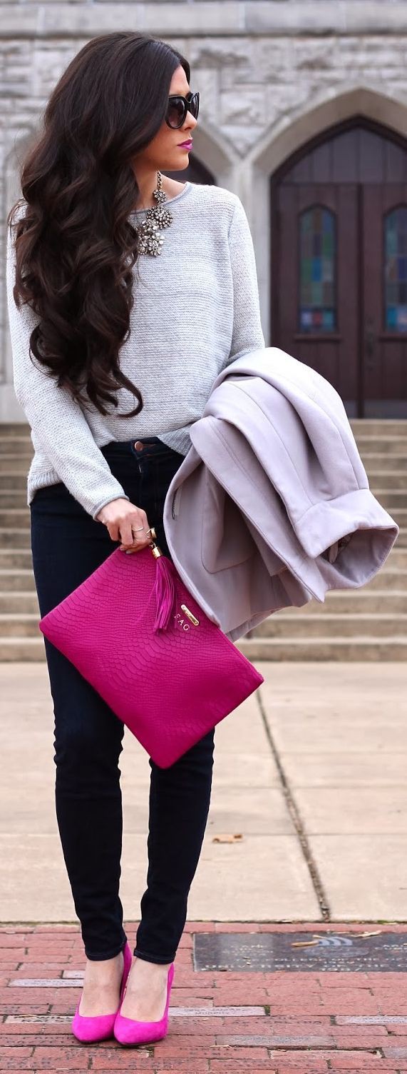 浅灰色上衣搭配黑裤子也很棒,下面这位模特也加上了装饰项链,而且搭配的是一款玫红色手拿包,刚好和玫红色浅口鞋相照应。