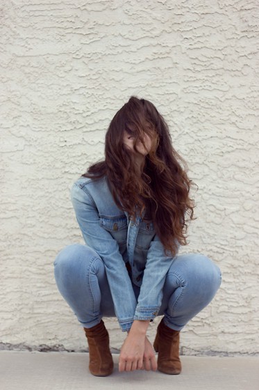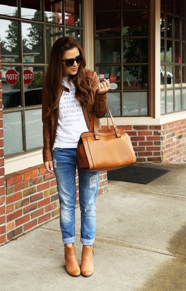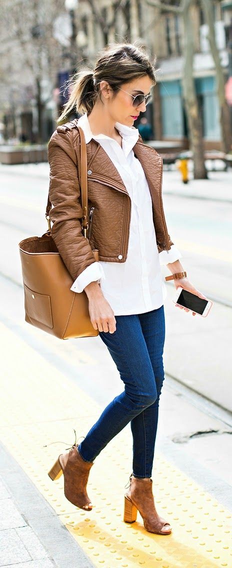 棕色皮衣+白色打底+牛仔裤+棕色踝靴+棕色大包