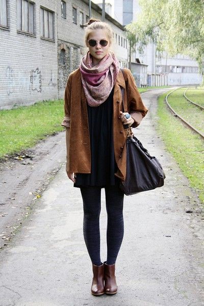 棕色宽松外套+小黑裙+棕色踝靴+淡紫围巾
