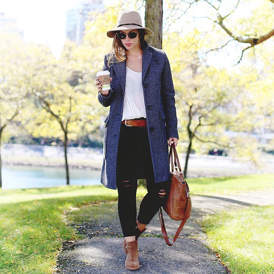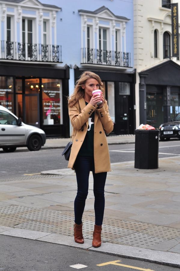 黑色大衣+白色毛衣+复古牛仔裤+棕色踝靴