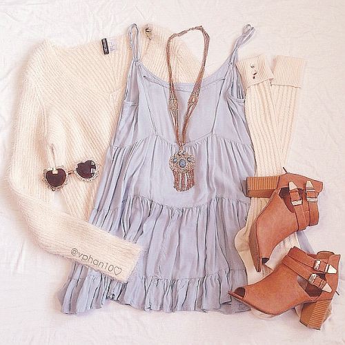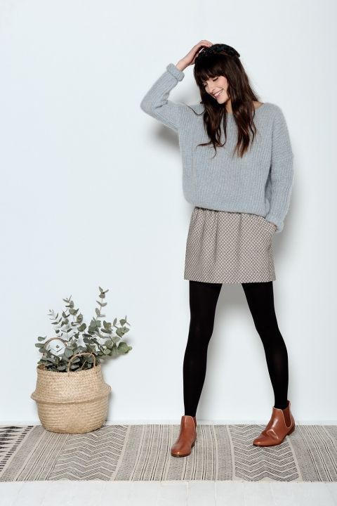 不只是浅蓝色和灰色相搭配,浅粉+浅灰/浅蓝+浅粉/米黄+浅灰……这样的上下组合都能营造出清新日系的少女感,和复古的棕色踝靴配在一起绝对棒棒哒。马卡龙色的可爱毛衣穿起来~
