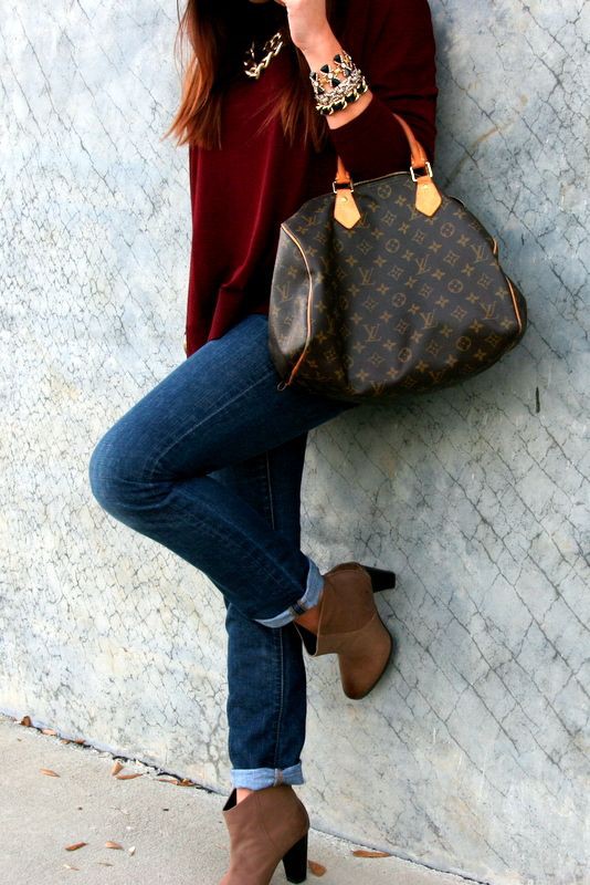 酒红色和棕色也很合拍,正因为棕色踝靴属于非黑色的鞋款,那么很容易就能和衣服颜色搭配出撞色的效果,酒红色毛衣配牛仔裤也是不错的。