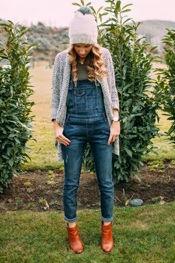 6.灰色毛衣开衫+背带裤+棕色踝靴