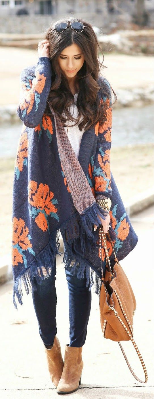 深蓝色印花大衣+白色内搭+棕色踝靴+棕色大包