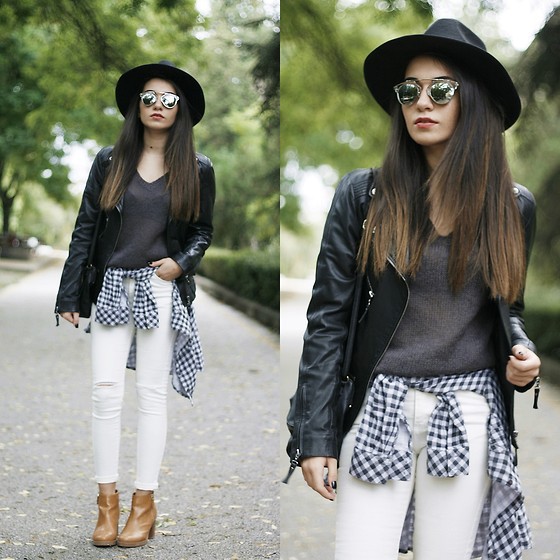 8.黑色皮衣+灰色毛衣+白色铅笔裤+棕色踝靴