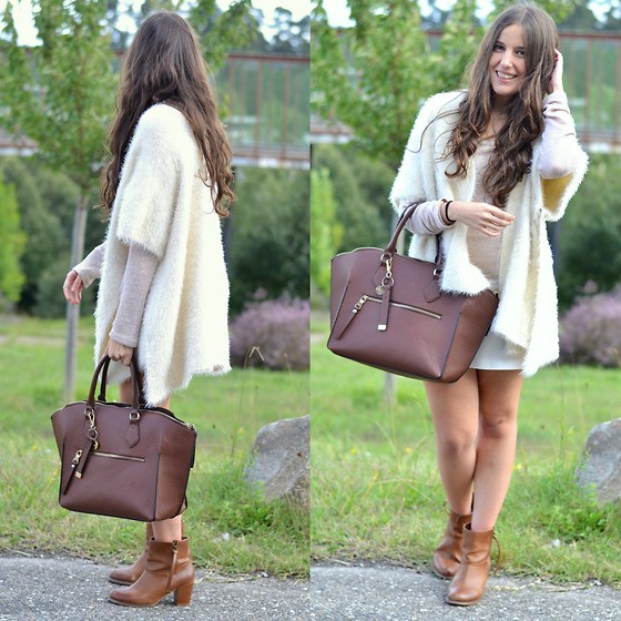 看着很温暖的衣服装扮,冬天可以试试这种毛茸茸的白色外套,内搭灰色毛衣裙,加上棕色踝靴。精致中带着轻熟女的小性感哦。