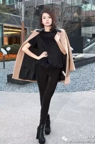 这是冬天比较实用的搭配方法。黑色小领口套头衫+黑色拼接铅笔裤+浅咖啡色毛呢大衣,小领口短袖套头衫,是经典的优雅单品,适合职场,全黑的造型,有很强的御姐气场,而且黑色造型中皮质的比重越大,力量感就越强,比如这个皮质拼接裤子,对气场提升有很大帮助。
