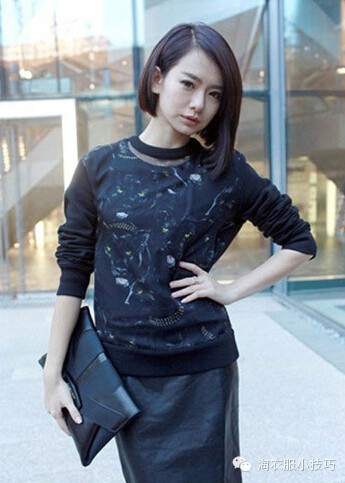 职场中不一定每天都是西服套装,偶尔用黑色卫衣+皮裙+信封手包这样的半休闲组合,也可以打造职场御姐风格。